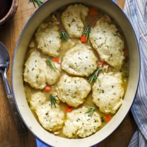 This recipe is everything I remember about dumplings from when I was a kid, but with a grown-up touch of appley sweetness and aromatic fresh rosemary. The homemade dumplings cook on top of the soup, plumping in the heat of the Dutch oven. Even as an adult, dumplings are still the best part of chicken and dumplings soup, right?
