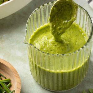 I prefer mine to be thinner for dressing salad, but you could easily make this a green goddess dip by keeping it nice and thick.