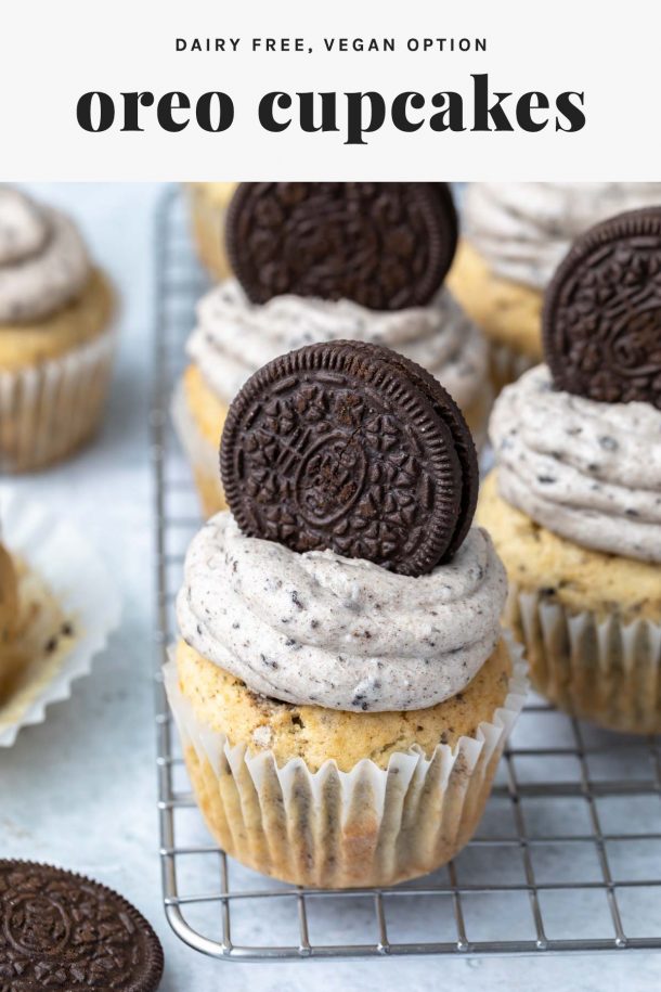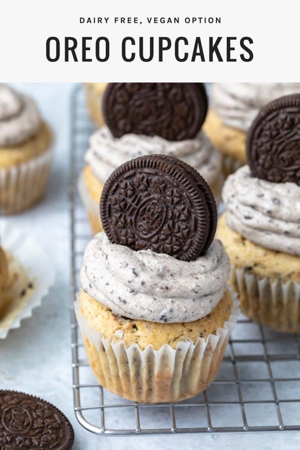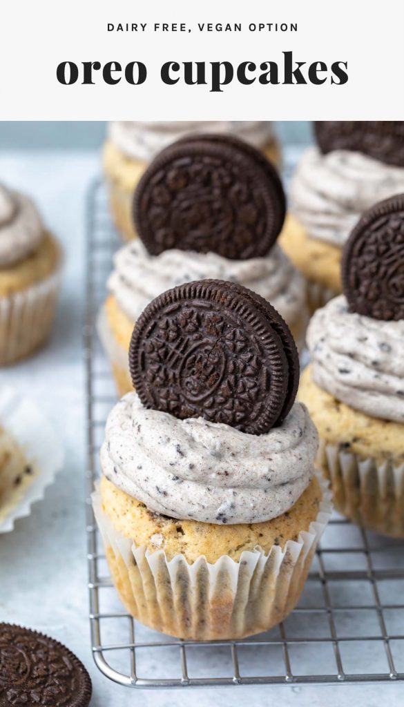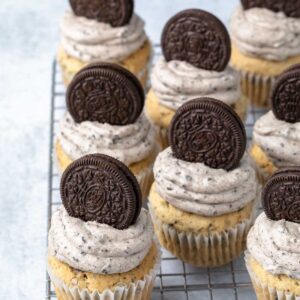 Frost and garnish the cupcakes. Once the cupcakes have cooled completely, frost the cupcakes and, if you want, top each cupcake with a full Oreo cookie.