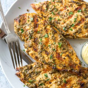 - Chicken – I like to use boneless, skinless chicken breasts for this recipe. The lean meat of chicken breasts absorbs the flavors of the marinade well. Plus, their relatively uniform thickness works wonders when cooking on the grill. Plus, if they are not even you can easily pound them to an even thickness.