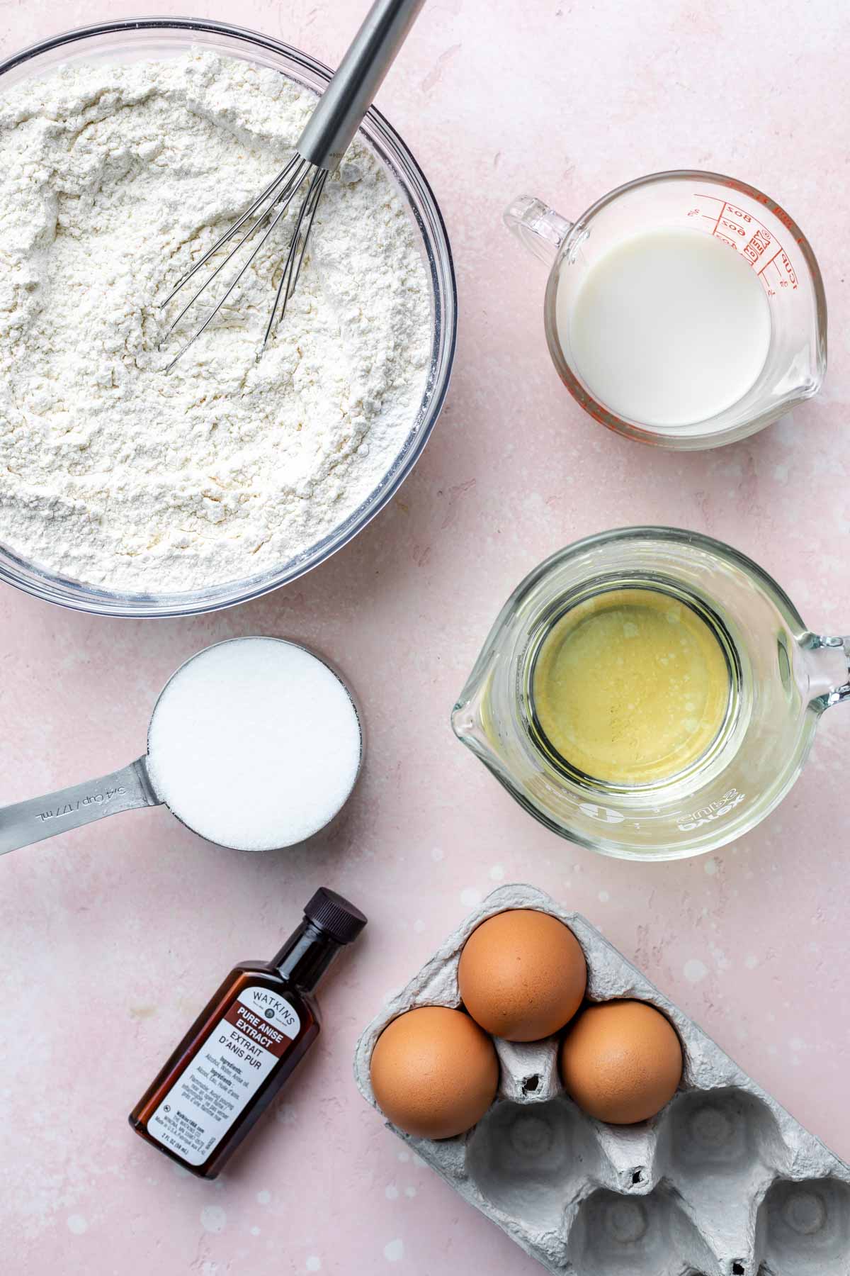 Beat the wet ingredients. Using an electric mixer, beat the eggs, sugar, oil, milk and extract until they are nice and smooth.