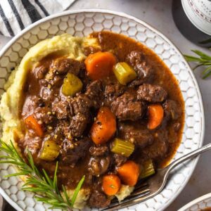 This recipe doesn’t have potatoes in the stew itself. I prefer to serve mine over creamy, dairy free mashed potatoes instead, but if you’re in the mood for a complete one-pot meal, feel free to throw a few cut up potatoes into the mix.