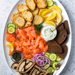 You can also serve your smoked salmon platter with bagels (bonus points if they’re sourdough bagels), which would be perfect for brunch and some bagel chips or crackers. Whatever you like will work. Just make sure you have a few options for your guests.