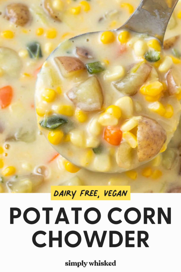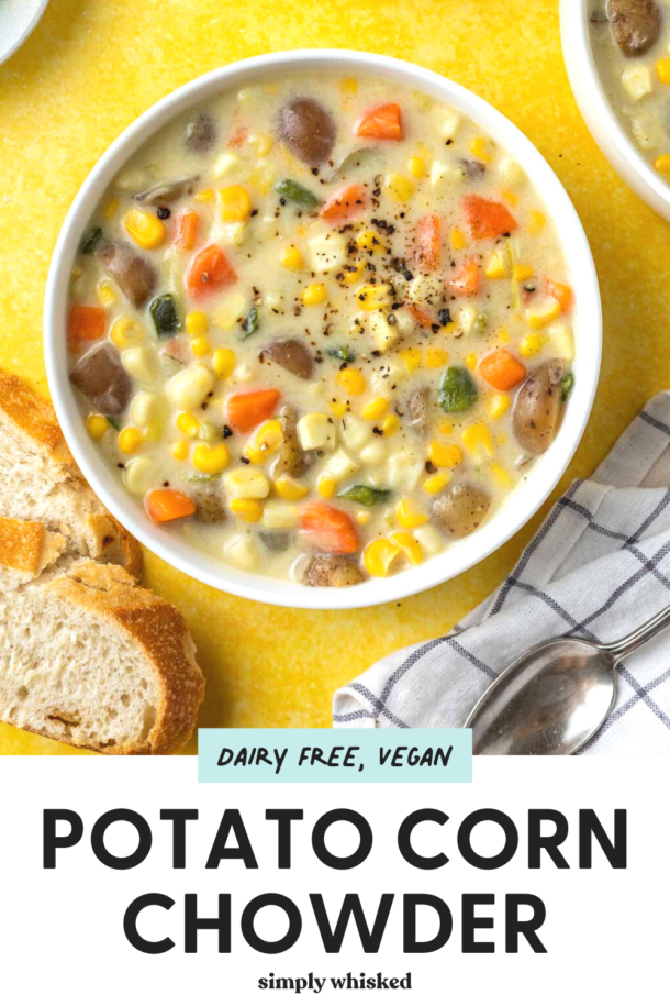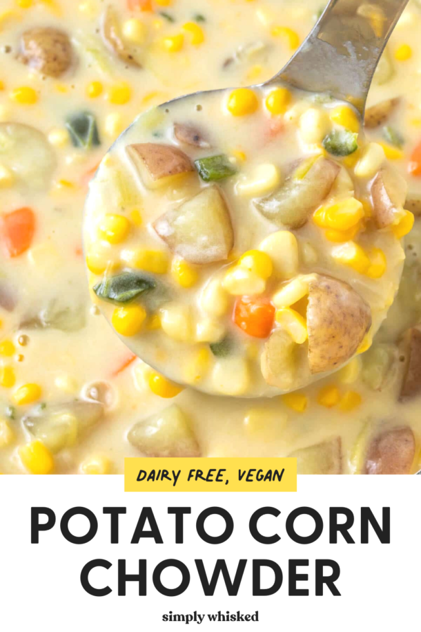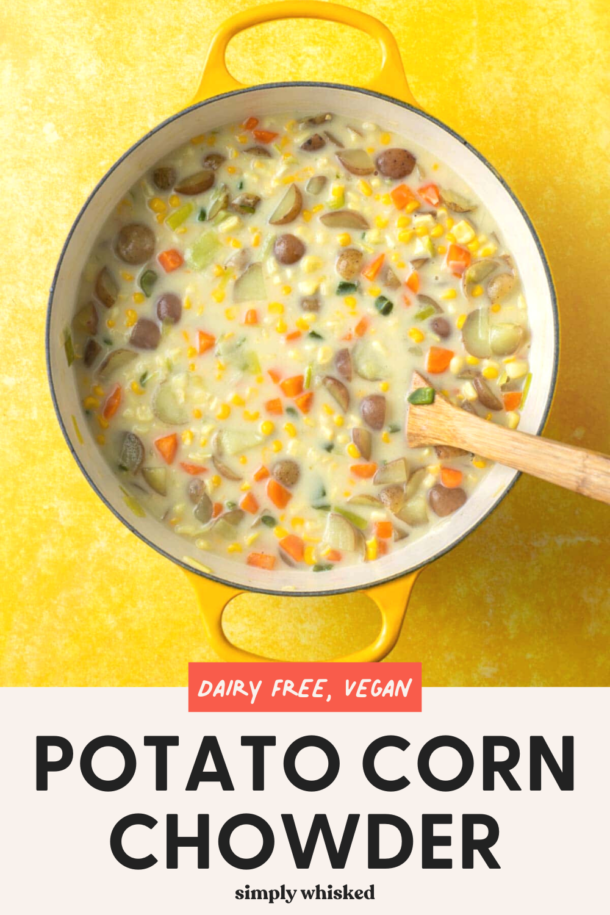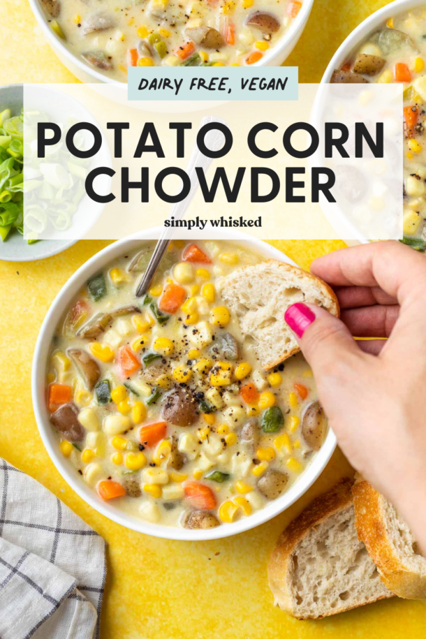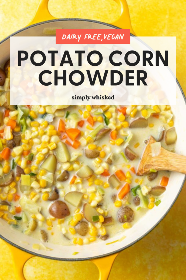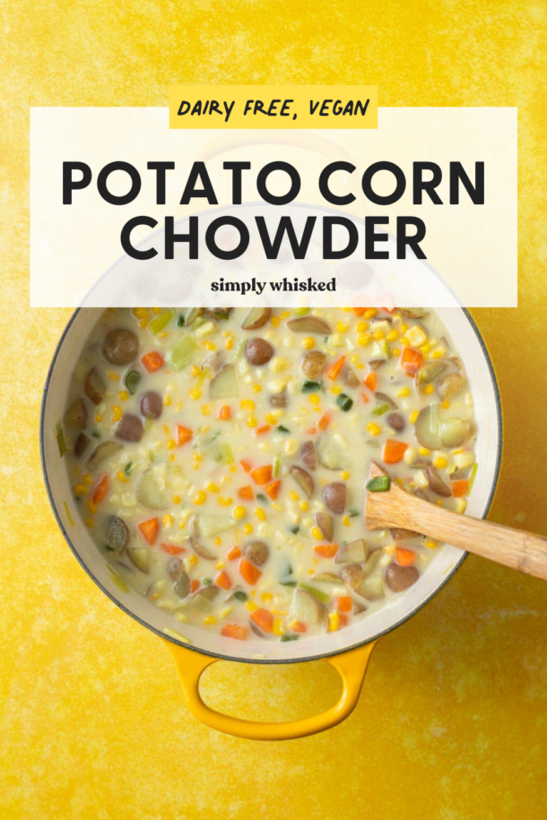 This hearty and filling potato corn chowder is light and dairy free, so it’s great for keeping those New Year’s resolutions. I have been totally obsessed with potatoes lately. I’ve been adding them into everything and planning meals around them. I think it’s because potatoes are secretly healthy. I know that that’ve gotten a bad rep thanks to French fries and potato chips, but potatoes can be a really healthy way to work some filling carbs in your diet. They have really been my friend lately.
